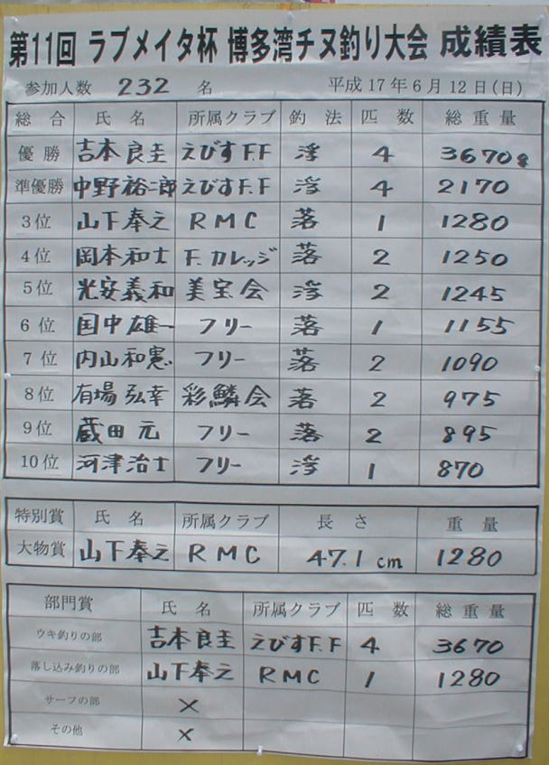 | 記載日 | 第11回ラブメイタ杯博多湾チヌ釣り大会 |
